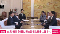 転載元: それでも動く名無し 2025/10/18(土) 21:49:24.75 ID:Vc+oGudB0 連立協議を行っている自民党と日本維新の会は、週明け月曜日の20日にも連立政権の合意書に署名する見通しであることが分かりました。これにより高市総裁が初の女性総理に選出される公算が大きくなりました。 維新は19日午後、大阪市で常任役員会を開き、連立協議について最終的な調整を行います。 関係者によりますと、両党は20日に連立政権の合意書に署名を行う見通しです。 維新からは当面、入閣せず、閣外協力の形を取ることになります。 これまで維新は議員定数を1割削減する法案を年内に成立させることなどを求めていて、自民側は応じる方針です。 2: それでも動く名無し 2025/10/18(土) 21:49:39.69 ID:Vc+oGudB0 ※…