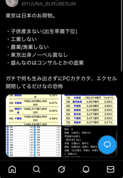 1: 2025/10/18(土) 21:34:03.44 東京は日本のお荷物。・子供産まない(出生率最下位)・工業しない・農業/漁業しない・東京出身ノーベル賞なし・盛んなのはコンサルとかの虚業ガチで何も生み出さずにPCカタカタ、エクセル開閉してるだけなの恐怖 pic.twitter.com/qkZWzbNyIl— 東京脱出ゆりな🐮牛乳パック (@YUUNA_BURUBESUM) October 18, 2025 ※関連記事 【衝撃】東京、ガチで最高すぎるwwwwwwww理由がこちらwwwwwwww…
