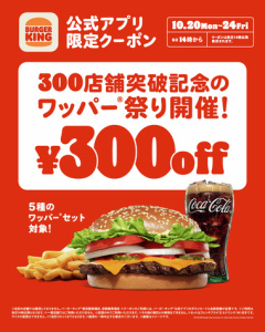 【朗報】バーガーキング、300店舗突破!5種のワッパーセットが300円引きになる「ワッパー祭り」開催 10月20日~24日の5日間