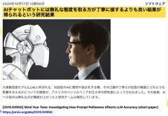 1 : AIチャットボットには無礼な態度を取る方が丁寧に接するよりも良い結果が得られるという研究結果 大規模言語モデル(LLM)と呼ばれる、対話型のAIに質問や指示をする際、その口調や丁寧さが回答の精度にどのような影響を与えるかについての調査が、アメリカのペンシルベニア州立大学の研究者によって行われました。 その結果、AIへの指示は無礼な方が精度が上がったと研究チームは報告しています。 (以下略、続きはソースでご確認ください) gigazine 2025年10月17日 12時00分 2 : ポイントは丁寧か無礼かってことより質問が回りくどいか簡潔かってことなんだろう 3 : せや、人間にも適用したろ!…