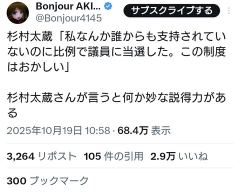 1:アリエル(東京都) [PL]:2025/10/19(日) 19:11:12.13 ID:M0E8xOcb0 BE:662593167-2BP(2000) 2:プランク定数(庭) [CN]:2025/10/19(日) 19:11:32.49 ID:i8o9Pp7Z0 草 3:フォボス(SB-Android) [FR]:2025/10/19(日) 19:12:01.83 ID:PWxDWoRh0 政治お笑い芸人 4:ミザール(新潟県) [JP]:2025/10/19(日) 19:12:20.83 ID:psN7XIl60 本当にその通り 与党から出馬すればゴミでも政治家になれちゃう…