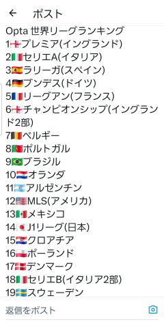 27: 名無し@サカサカ10 2025/10/20(月) 01:54:21.11 リーグランキング 92.6…プレミア 87.0…セリエA 87.0…リーガ 86.3…ブンデス 85.5…リーグアン 80.9…チャンピオンシップ 80.5…ベルギー 79.8…ポルトガル 79.4…ブラジル 78.8…エールディヴィジ ←…