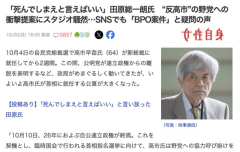 1 : 「死んでしまえと言えばいい」田原総一朗氏 “反高市”の野党への衝撃提案にスタジオ騒然…SNSでも「BPO案件」と疑問の声 19日放送の討論番組『激論!クロスファイア』(BS朝日)では、自民党・片山さつき氏(66)、 立憲民主党・辻元清美氏(65)、社民党・福島瑞穂氏(69)の3名の参議院議員をゲストに迎え、 「高市首相誕生」を見越した議論が行われた。ただ、途中、MCの田原総一朗氏(91)から飛び出した発言に、スタジオが騒然とする場面があった。 (略) 二人の主張を聞いた田原氏は、「(高市氏に)反対すればいいじゃん」と提言。さらに、こう投げかけた。 「あんな奴は死んでしまえと言えばいい」 冗談のつもりか、わずかに笑みを浮かべる田原氏だったが、福島氏は「それは絶対に……」と制止し、辻元氏も「田原さん、そんな発言して高市さんと揉めてたでしょ、前も」と叱りつけた。「僕は高市氏と激しくやり合った」と話を続けようとする田原氏だったがCMが入り、この話題は打ち止めとなっていた。 3 : 老guy 4 : 91て もうやめろ(´・ω・`)…
