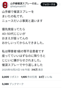 1: 2025/10/21(火) 14:25:39.29 山手線で催涙スプレーをまいたの私です。ニュースだいぶ事実と違います優先席座ってたら40-50代じじいがおまえが座ってんのおかしいってからんできました。私は障害者1級の腎不全患者です座ってていいはずなのに降りろとじじいに嫌がらせされました。催涙スプレーでやり返しました— 山手線催涙スプレーの女です (@helpmark111) October 20, 2025 ※関連記事 山手線で催涙スプレーを噴射し逮捕された女さん、「勾留に耐えられない」と判断され無事釈放…