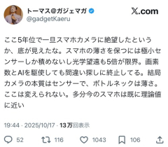 1: 2025/10/21(火) 13:35:20.19 ここ5年位で一旦スマホカメラに絶望したというか、底が見えたな。スマホの薄さを保つには極小センサーしか積めないし光学望遠も5倍が限界。画素数とAIを駆使しても間違い探しに終止してる。結局カメラの本質はセンサーで、ボトルネックは薄さ。ここは変えられない。多分今のスマホは既に理論値に近い— トーマス@ガジェマガ (@gadgetKaeru) October 17, 2025 apsc 積んだらだいぶ変わるやろうけど1インチ積んだところで って感じではあるのがな🤔— トーマス@ガジェマガ (@gadgetKaeru) October 20, 2025 ※関連記事 【画像】この漫画の「ダメ人間」と付き合っている彼女の話、少し怖くて草wwwww…