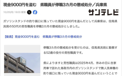 1 : 停職3カ月の懲戒処分を受けたのは、但馬県民局に勤務する52歳の役付の男性職員です。 県によりますと男性職員は2025年4月、休みの日に自家用車で訪れた鳥取市内のガソリンスタンドで無人洗車機の釣り銭口に残っていた現金9000円を盗んだということです。 持ち主から警察に被害届があったことで発覚し、その後、男性職員は、書類送検されていて不起訴処分となっています。 県の調べに「魔が差した」と話していて男性職員は、全額を返金したということです。 3 : 気の毒な話だが県民局ならまぁいいか 4 : まぁこの場合は魔が差すのわかるわ それに自販機の釣り銭探してる爺とか見かけるしw…