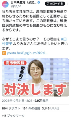【速報】共産・田村委員長「高市新政権を短命で終わらせるため、徹底的に対戦します」対話をする気はない模様、やはり暴力なのか