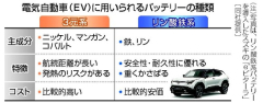 ホンダや日産自動車など自動車大手が相次いで打ち出す新型電気自動車(EV)で、陰の主役とされるのがバッテリーだ。各社とも軽量化の技術開発や中国メーカーで多く使用される種類を導入するなどして性能向上を図る。バッテリーはEVの航続距離や耐久性を左右し、車両価格の3分の1を占める。それだけに開発競争に熱が入る。 スズキが来年1月に発売する多目的スポーツ車(SUV)タイプの小型EV「eビターラ」では、中国EV最大手の比亜迪(BYD)など中国勢が得意とする「リン酸鉄リチウムイオンバッテリー」が採用されたことが話題を呼んだ。「リン酸鉄系」は、安全性と耐久性が高く、安価なのが利点。一方、蓄えられるエネルギーに関わる内部の密度が低く効率が悪いため、航続距離が伸びないとされてきた。 スズキの小野純生BEVB・C商品統括部長は9月半ばの発表会で、記者団に「安心・安全が第一。燃えにくく、耐久性が高い」と利点を強調した。課題の航続距離に関しても、バッテリー大手AESCジャパンの野田俊治常務は「積載方法を工夫することで密度を上げたことが突破口となった」と、性能向上が進んでいると明かす。 これに対し、欧米勢は主に「3元系リチウムイオンバッテリー」を採用。エネルギー密度向上や軽量化に向けた技術革新を競ってきた。 日本勢も「3元系」が主流で、ホンダが先月発売した軽EV「N―ONE e:」でも採用。バッテリーの薄型化に成功し、一回の充電で走れる航続距離は国内の軽EVでは最長の295キロを実現した。日産の3代目「リーフ」も「3元系」だ。ただ、欧米勢でもリン酸鉄系採用の動きがあるとされ、今後、勢力図が変わる可能性はある。 一方、EVバッテリーで課題となっているのは、リサイクル体制の整備だ。野田氏は「今は中古品を回収する仕組みが確立されていない。国を挙げて規制する必要がある」と話す。特にリン酸鉄系は、原材料が安価なためリサイクルが進まないとの見方もあり、EVの普及とともにバッテリーの回収・再利用の仕組みの整備も急ぐ必要がありそうだ。…
