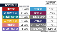 転載元: それでも動く名無し 2025/10/22(水) 23:07:40.63 ID:aqn9fz070 読売新聞・NNN緊急世論調査(10月21~22日実施) 政党支持率 無党派 34( -1) 自民 32(+5) 参政 7( -1) 立憲 6(+1) 維新 5(+3) 国民 5( -4) 公明 4(+1) みらい 1(+1) 社民 1(±0) 保守 1(±0) 共産 1( -1) れいわ 1( -2) ※ 2: それでも動く名無し 2025/10/22(水) 23:07:55.64 ID:aqn9fz070 どうすんのこれ…