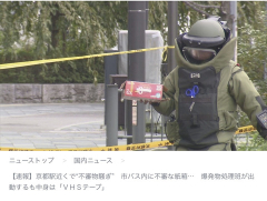 1:グレートウォール(茸) [GB]:2025/10/22(水) 14:01:14.11 ID:e7xNOw3A0 BE:632443795-BRZ(11000) 【速報】京都駅近くで“不審物騒ぎ” 市バス内に不審な紙箱… 爆発物処理班が出動するも中身は「VHSテープ」 10月21日(火)午前、京都市バスで不審物騒ぎが発生しました。不審な箱から見つかったのは「VHSテープ」でした。 21日(火)午前10時半ごろ、京都市交通局の横大路営業所から、「バスの中に、バッテリーの箱に入った持ち主不明の物がある」「移動中で八条口に着くので来てほしい」と京都府警に通報がありました。 不審な箱が見つかったのは、JR京都駅近くを走行していた京都市バスで、▽バスの乗客約30人が車外に避難したほか、▽八条通の竹田街道から油小路通が全面通行止めとなるなど、京都駅八条口周辺では通行規制が発生。 さらに、▽京都市バスの一部区間が一時運休となったほか、▽近隣の建物の利用者に窓際から離れることが呼びかけられるなど、大きな影響が出ました。 バスの乗員・乗客などに、けが人はいませんでした。 府警の爆発物処理班が出動して対応にあたりましたが、箱に入っていた物は「数本のVHSテープ」であると確認されたということです。 箱が置かれていたのは、バスの後方部分の座席の足元で、府警はドライブレコーダーの映像を解析するなどして、置いた人物などについて捜査を進める方針です。 2:ビッグクランチ(みかか) [ニダ]:2025/10/22(水) 14:02:38.21 ID:SQOntpsw0 エロビ?…