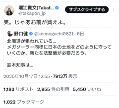 1: 2025/10/23(木) 08:55:21.30 笑。じゃあお前が買えよ。 — 堀江貴文(Takafumi Horie、ホリエモン) (@takapon_jp) October 17, 2025 ※関連記事 【悲報】ホリエモンさん、正論を言われてまともな反論できず…