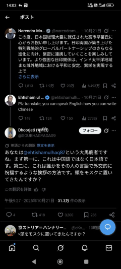 【悲報】外人のレスバ、ちょっとオシャレで草。パキスタン人「中国語分かんねーよ」→インド人「日本語だが?脳みそモスクに忘れてきたのか?」