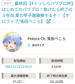 引用元: 851: Vtuberまとめ2025/10/24(金) 01:11:20.47 マリンの2年夏ですら6.5万出たのにしょぼいなぁ ぺこらが同条件なら7万出してる 864: Vtuberまとめ2025/10/24(金) 01:11:34.42 >>851 それはそう 878: Vtuberまとめ2025/10/24(金) 01:12:04.95 >>851 しかもドラフトメンバーあんなによかったのにこの程度だとはね 917: Vtuberまとめ2025/10/24(金) 01:13:39.14 >>851 言うほど盛り上がるポイントなかったしこんなもん 918: Vtuberまとめ2025/10/24(金) 01:13:40.28 >>851 ぺこら甲子園最終回 3.7万人 みこち甲子園最終回 5.2万人 924: Vtuberまとめ2025/10/24(金) 01:13:54.27 >>918 あ 926: Vtuberまとめ2025/10/24(金) 01:14:04.18 >>918 消せ 931: Vtuberまとめ2025/10/24(金) 01:14:19.51 >>918 同条件じゃなくて草 933: Vtuberまとめ2025/10/24(金) 01:14:24.03 >>918 完 全 敗 北 934: Vtuberまとめ2025/10/24(金) 01:14:24.06 >>918 草ぁ! 943: Vtuberまとめ2025/10/24(金) 01:14:45.80 >>851 2年目夏6.7万ですが 945: Vtuberまとめ2025/10/24(金) 01:14:48.21 >>918 野うさぎこれどういうこと? 948: Vtuberまとめ2025/10/24(金) 01:15:00.24 >>918 ミミーチンで燃える前に3.7ってさ 今やったら2万くらいじゃね? 954: Vtuberまとめ2025/10/24(金) 01:15:11.96 >>918 もうやめよう 959: Vtuberまとめ2025/10/24(金) 01:15:21.42 >>948 それは思った 960: Vtuberまとめ2025/10/24(金) 01:15:22.37 >>943 ぺっさんいつも負けてるな 987: Vtuberまとめ2025/10/24(金) 01:16:53.76 >>943 つまらなすぎて優勝したのに弱体化してるの草 996: Vtuberまとめ2025/10/24(金) 01:17:22.86 >>943 えぇ…どんだけ質なし判定されたんだよ……