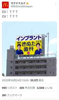 1:以下、?ちゃんねるからVIPがお送りします:2025/10/24(金) 19:45:03.198 ID:p2WmR66AM.net なんで歯医者とコラボしてんの 2:以下、?ちゃんねるからVIPがお送りします:2025/10/24(金) 19:45:48.893 ID:tq3Nw0rs0.net ゆとりに宣伝やらすな…