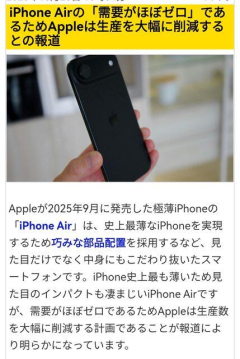 【悲報】iPhoneAir、余りに売れなくて大幅減産へwwwwwwww
