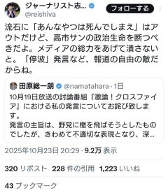 1:2025/10/25(土) 08:59:20.07 ID:R04n/8IN0すごいよなぁ。もう、日本において報道は命脈を絶たれたと言っても過言ではない感じ。 — ☘️ながし☘️ (@Pnagashi) October 24, 2025転載元スレッド:…
