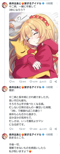 引用元: 486: Vtuberまとめ2025/10/25(土) 12:39:30.89 はあちゃま最近ずっとこんな感じなんだけど、大丈夫そ? 520: Vtuberまとめ2025/10/25(土) 12:40:25.74 >>486 お前ら並みに何言ってるか理解できねーな 533: Vtuberまとめ2025/10/25(土) 12:40:49.49 >>520 理解できたらやべえよ 540: Vtuberまとめ2025/10/25(土) 12:41:07.05 >>486 この前の雑談もこの調子でリスナーが絶句してたな 548: Vtuberまとめ2025/10/25(土) 12:41:20.80 >>486 なんか宗教でもハマってる? 561: Vtuberまとめ2025/10/25(土) 12:41:43.38 >>486 妄想ですまんけど なんかやってる? 575: Vtuberまとめ2025/10/25(土) 12:42:12.66 >>486 意訳が意訳になってなくて何を言ってるのかさっぱりわからん 595: Vtuberまとめ2025/10/25(土) 12:42:53.99 >>486 厨二病扱いされてキレてんの? 597: Vtuberまとめ2025/10/25(土) 12:42:55.75 >>486 統失発症してないか? 598: Vtuberまとめ2025/10/25(土) 12:42:55.93 >>486 ストロングゼロ3本くらい飲んだ後の文章 615: Vtuberまとめ2025/10/25(土) 12:43:32.04 >>486 意訳の方がちょっと何言ってるか状態でクカ 621: Vtuberまとめ2025/10/25(土) 12:43:46.71 >>486 ありのままの自分で人気者になりたいのに理解されないどころかバカにされまくって少しずつメンタルの歯車狂ってていってる感じがする 630: Vtuberまとめ2025/10/25(土) 12:43:58.48 >>597 おもった この前の配信でも時々配信が応答なしになることを「電波攻撃きましたね」とかいってたし 661: Vtuberまとめ2025/10/25(土) 12:45:12.07 >>621 ありのままで人気になれるならこんな惨状になってないんだよね 星川を見習え 674: Vtuberまとめ2025/10/25(土) 12:45:42.94 >>486 文章も意味不明だけど、そもそも山芋ってあたたまるの? あんまり加熱して食べるものじゃ無くね?…