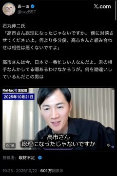 【悲報】石丸伸二「高市さん総理になったじゃないですかぁ、ぼくに対談させてくださいよw」