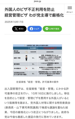 1: 名無し 2025/10/25(土) 14:11:23.71 ID:4qTpJPui0 BE:271912485-2BP(2000) 要件 ・経営管理経験3年以上または経営修士相当の学位(以前は不要) ・日本人または永住者の雇用必須(以前は不要) ・日本の専門士が確認した事業計画書の提出必須(以前は不要) ・資本金3000万円以上(以前は500万円) ・相当程度の日本語能力必須(以前は不要) 今持ってる人も猶予期間3年後のビザ更新時からこの条件が適応され審査される 自民党主導で改定されたとのこと 「日本への道は完全に塞がれた」…10月からの「経営・管理ビザ」厳格化で在日中国人が震える「致命的な一文」 高市首相に「メッセージが明確だ。ありがとう」とゼレンスキー大統領… 英首相も「彼女の言葉は力強かった」 【画像】 松井稼頭央の嫁(51)が※※らなんでも即ハボすぎる! 配達員が荷物を届けにやってきた。この場合、悪いのは誰?→「置き配」をしたらこうなった……