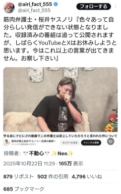 筋肉弁護士・桜井ヤスノリ『色々あって自分らしい発信ができない状態となりました』