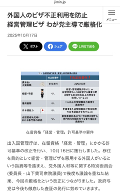 1:ガーネットスター(茸) [US]:2025/10/25(土) 14:11:23.71 ID:4qTpJPui0 要件 ・経営管理経験3年以上または経営修士相当の学位(以前は不要) ・日本人または永住者の雇用必須(以前は不要) ・日本の専門士が確認した事業計画書の提出必須(以前は不要) ・資本金3000万円以上(以前は500万円) ・相当程度の日本語能力必須(以前は不要) 今持ってる人も猶予期間3年後のビザ更新時からこの条件が適応され審査される 自民党主導で改定されたとのこと 「日本への道は完全に塞がれた」…10月からの「経営・管理ビザ」厳格化で在日中国人が震える「致命的な一文」 2:ガーネットスター(茸) [US]:2025/10/25(土) 14:11:39.81 ID:4qTpJPui0 かわいそう😭…