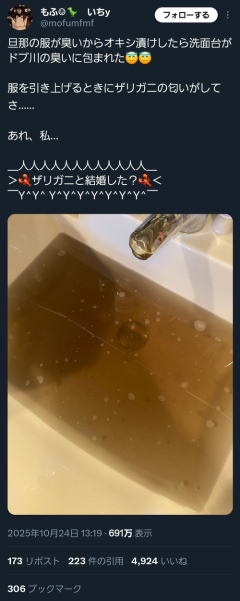 1: 2025/10/26(日) 11:24:05.02 旦那の服が臭いからオキシ漬けしたら洗面台がドブ川の臭いに包まれた😇😇服を引き上げるときにザリガニの匂いがしてさ……あれ、私…_人人人人人人人人人人人人_>🦞ザリガニと結婚した?🦞< ̄Y^Y^ Y^Y^Y^Y^Y^Y^Y^ ̄ pic.twitter.com/VeFsbpgqC8— もふ☺︎ 🦖 いちy (@mofumfmf) October 24, 2025 ※関連記事 【画像】この漫画の「ダメ人間」と付き合っている彼女の話、少し怖くて草wwwww…