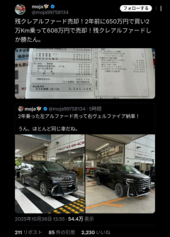 1: 2025/10/26(日) 21:14:29.64 残クレアルファード売却!2年前に650万円で買い2万Km乗って608万円で売却!残クレアルファードしか勝たん。 pic.twitter.com/PJQ3kzzufy— moja🧚♀️ (@moja99758134) October 26, 2025 ※関連記事 【画像】この漫画の「ダメ人間」と付き合っている彼女の話、少し怖くて草wwwww…