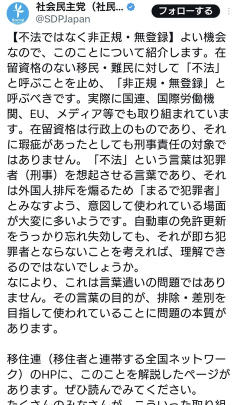 1:白黒(庭) [GB]:2025/10/26(日) 13:13:47.82 ID:qpALr9Ls0 BE:662593167-2BP(2000) 「在留資格がないのは行政上の瑕疵であって犯罪ではない」社民党の主張は、法の条文を無視しています。入管法70条は、在留資格を失ったままの滞在を「3年以下の懲役または300万円以下の罰金」と定めています。「不法」は差別語ではなく法的用語。… — 新垣よしとよ 沖縄県議会議員(自民党) (@yo4104) October 25, 2025 3:アメリカンカール(茸) [FR]:2025/10/26(日) 13:14:28.00 ID:RbY1AQLA0 犯罪者でしょ 4:シンガプーラ(東京都) [US]:2025/10/26(日) 13:15:04.26 ID:GE/SFCQG0 ということは非正規雇用は不法雇用ってことになるぞ 5:ベンガル(庭) [GB]:2025/10/26(日) 13:15:10.77 ID:UqBu/6yc0 社会党が反対してるなら、不法移民で正解だな。…