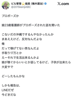 1: 2025/10/27(月) 17:49:39.62 プロポーズか娘23歳看護師がプロポーズされた話を聞いたこないだの沖縄でするんやなかったんかまあええけど、反対なんだよな俺だって稼げてない男なんだよ手取り17万とかえーそれで生活出来るんかよ娘が稼ぐからいいとか話してるけど、子供が出来たら大変やでどーしたもんかな… pic.twitter.com/pTme1vV6gN— ビル管理⭐️組長(梅木建治) (@2015kenjiABC) October 25, 2025 それが40歳なんすよ— ビル管理⭐️組長(梅木建治) (@2015kenjiABC) October 25, 2025 ※関連記事 【悲報】女さん「生活費折半とか言われたからプロポーズお断りした」←共感者多数で9万イイネwwww…