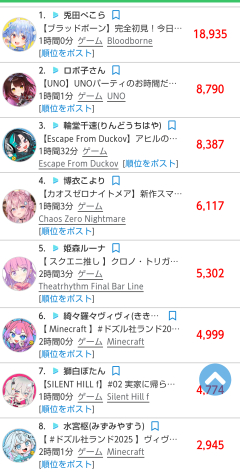 引用元: 1752: Vtuberまとめ (ワッチョイW d83b-Z519) 2025/10/27(月) 21:03:21.66 ID:nUYijdj6 ちはーや8000人出してるけど多分ゲマズファンの受け皿になってるよ 1803: Vtuberまとめ (ワッチョイW 7612-yLA0) 2025/10/27(月) 21:04:31.66 ID:9seJ9yqM >>1752 ちはーや最近人気出てきたか? この前も1万出てたしフログロの王か? 1833: Vtuberまとめ (ワッチョイ eb8e-nSdp) 2025/10/27(月) 21:05:05.84 ID:e3a7ukWO >>1752 ゲマズ連中に名前を売ったからな 1836: Vtuberまとめ (ワッチョイ 0b5b-S2iZ) 2025/10/27(月) 21:05:08.93 ID:PeP5sqfq >>1752 にゃんにゃの受け皿は兼ねてるな 俺がそうだから 1847: Vtuberまとめ (ワッチョイW 4ce5-I859) 2025/10/27(月) 21:05:35.59 ID:Cn0zwECS >>1752 派閥バフ+流行りゲーバフやね 1861: Vtuberまとめ (ワッチョイ 961a-MMzX) 2025/10/27(月) 21:05:54.87 ID:AbO9LVSW >>1752 ちはのダッコフは見やすい 1887: Vtuberまとめ (ワッチョイ aac1-CEti) 2025/10/27(月) 21:06:34.39 ID:S3jJh6c1 >>1752 今ダッコフはバフゲーだよ 最近ソロ配信2000以下が当たり前の渋ハルが4000超えてたし 1958: Vtuberまとめ (ワッチョイ 4307-dzDq) 2025/10/27(月) 21:08:28.24 ID:bXO6P7iH >>1752 千速って大豆前まですうちゃんと同じくらいの同接だったから ガチで大豆のおかげで伸びたと思う 首都高とかグランツーリスモみたいな明確な強みもあるし 十八番なゲーム以外でも期生トップの同接叩き出せるようになってるし 先輩陣との関係性も良好で隙が無い…