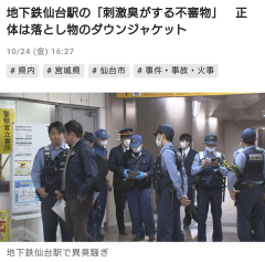 1 : 24日午後、仙台市青葉区の地下鉄仙台駅で不審物が見つかり消防や警察が出動する騒ぎがありましたが、不審物の正体はダウンジャケットだったことが分かりました。 消防などによりますと24日午後3時27分ごろ、仙台市青葉区の仙台市地下鉄仙台駅の構内で、「不審物があり刺激臭がする」と通行人から消防に通報がありました。 消防と警察が出動し現場を確認したところ、ダウンジャケットが収められた袋が見つかりました。 消防が検知器を使って調べたところ有害な物質などは検出されず、臭いのもとはダウンジャケットに残っていた体臭とみられています。 3 : ヴォエっ🤮 4 : ホームレスが捨てたんか…