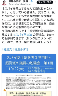 福島みずほ氏「スパイを防止するなんて当然じゃないか!と思っている皆さんへ」