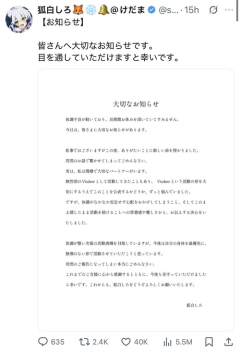 1: 2025/10/28(火) 10:43:05.372 【お知らせ】皆さんへ大切なお知らせです。目を通していただけますと幸いです。 pic.twitter.com/7BuyOf0Kkd— 狐白しろ🦊❄️🔔@けだま (@shir0_kohaku) October 27, 2025 ※関連記事 【画像】この漫画の「ダメ人間」と付き合っている彼女の話、少し怖くて草wwwww…