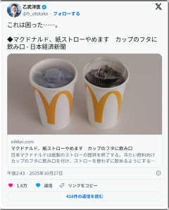1: 2025/10/28(火) 15:05:06.40 ID:V/NLSN7n0 マクドナルド「紙ストロー撤廃」方針に乙武洋匡さん「これは困った......」 投稿に納得の声「大切な視点」…