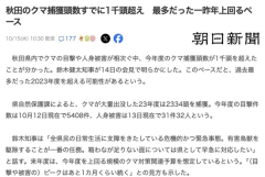 1 : 秋田のクマ捕獲頭数すでに1千頭超え 最多だった一昨年上回るペース(朝日新聞) - Yahoo!ニュース 秋田県内でクマの目撃や人身被害が相次ぐ中、今年度のクマ捕獲頭数が1千頭を超えたことが分かった。鈴木健太知事が14日の会見で明らかにした。このペースだと、過去最多だった2023年度を超える可能性があるという。 県自然保護課によると、クマが大量出没した23年度は2334頭を捕獲。今年度の目撃件数は10月12日現在で5408件、人身被害は13日現在で31件32人という。全文はソースで 2 : クマって一回の出産で何匹生むの? 21 : >>2 2頭ってニュースで見た 3頭もあり得る ごく稀に4頭だって…