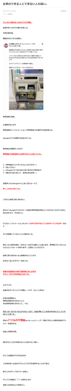 ◇ 1: 名無し 2025/10/29(水) 12:16:25.30 ID:2LELydq50 しみけん、空港で腹が立った出来事を告白 案内員の対応にムカッ!「あの人は一生うだつの上がらない人生」タレント・しみけんが28日までに自身のブログを更新。伊丹空港で「腹が立った」出来事についてつづった。 しみけんは「久しぶりに腹が立ったのでブログ更新」と切り出すと、会食のために大阪に訪れたと報告。「土地勘がないので 伊丹空港のインフォメーションで伊丹駅までの徒歩での道を聞いた。Googleナビでは徒歩18分ほどだった。目的地は大阪駅だったので伊丹駅まで歩き電車で240円で行こうと思っていた」という。 「し『伊丹駅までどうやったらいいのですか?』イ『遠いですよ』し『Googleナビでは18分と出てますので歩きます』イ『南口から出て歩いて、走井の交差点を~』」とやり取りを明かすと「実際歩いたらGoogleナビと全く違うルートで、歩くと45分と出ていた」と思っていた時間とかなり異なっていた。 「これだと会食に間に合わない。おそらくGoogleナビのスタート地点が伊丹空港の変なところからだったので18分と出たのだろう。それはいい。けどもインフォメーションの人も『18分では行けないことはわかっていたはず』なのにそこを指摘してこないことに腹が立った。僕だったら案内の際に『おそらく18分では難しいと思います。伊丹駅に行くのでしたら○○というルートがあります』と提案していただろう」と納得がいかない様子。 「会食に間に合わない&土地勘がないことから仕方なく流しのタクシーを拾った。気持ちは電車賃240円で目的地に着くはずがタクシー代で7000円ほどかかった。ムカついた。お金がかかったことにでは無い。(いや、ちょっとある)仕事の出来無さと時間を消費させられたことと 負の感情を持たされたこと、へだ。あの人は一生うだつの上がらない人生で、お金が無いことを世の中のせいにしていればいいと思った」とした。 ◇ 3: 名無し 2025/10/29(水) 12:17:43.47 ID:KJo0KQdA0NIKU 何が言いたいのか分からん ◇ 4: 名無し 2025/10/29(水) 12:17:45.49 ID:MM6efdKo0NIKU 最初からGoogleマップ使えや…