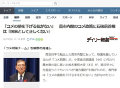 1: 名無し 2025/10/29(水) 14:27:22.14 ID:XfK0p9r2oU (1/1回レス) [] [-] 高支持率で船出した高市内閣の中で、早くも注目を集めているのが「コメ問題」だ。 新農水相・鈴木憲和氏が“復古農政”とも取れる方針を掲げ、コメの価格を「下げるべきではない」との姿勢を示した。 一方、前政権の石破茂前首相はこれに強く反論し、「高い米価は国家として正しくない」と主張した。 出典:デイリー新潮 ■要約 高市内閣で農水相に就任した鈴木憲和氏が、米価を下げない方針を示したことに対し、 前首相の石破茂氏が「国民が高い米を買わされるのはおかしい」と批判した。 鈴木氏は「総理が価格を口にすべきでない」と反論しており、 “コメ価格をどう維持するか”をめぐり、早くも旧政権との政策対立が表面化した形となった。 ■解説 米価をめぐる論争は、物価上昇と所得格差が広がる中で避けて通れないテーマだ。 鈴木大臣の「守る農政」は農村票に配慮したものとみられるが、 都市部の消費者からすれば、石破氏の「価格引き下げ論」に共感が集まりやすい。 一方で、安価な輸入米が増えれば国内農業の衰退を招くリスクもある。 高市政権がどの層を優先するのか、経済政策全体の方向性を占う試金石になりそうだ。 【83兆円投資】「日本は損失リスクゼロ」 対象は国家事業 ラトニック米商務長官 5500億ドル対米投融資 【画像】 田中みな実さん、なんか見えてるwwww 【ホロEN】 ビブー、ゲームのやりすぎでできた、自分の指のこぶをフワモコに紹介する…