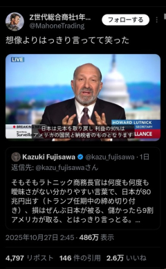 1: それでも動く名無し 2025/10/28(火) 13:49:54.53 ID:a4vEULwn0.net ええんか? 2: それでも動く名無し 2025/10/28(火) 13:50:09.05 ID:vS50M8+7r.net 草 3: それでも動く名無し 2025/10/28(火) 13:50:31.36 ID:QzLKGxfv0.net これもう令和の不平等条約じゃん…