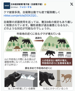 1. 匿名@ガールズちゃんねる 「憲法9条の元で、“武力行使”は、日本に対する武力攻撃が発生した場合、もしくは親密な関係にある国が攻撃を受け、これにより日本の存立危機が生じた場合に許容されます。そのため、枝野氏や佐藤氏が指摘している通り、憲法9条と獣害対策における武器使用は全く別次元の話です。なお、自衛隊法では、“外部からの武力攻撃”に対して、防衛のために武力行使が許容されると規定されていますが、獣害対策を目的に武器を使用することは想定されていません。 日経新聞の記事本文では、自衛隊法おける『治安出動』『防衛出動』など武器が使用できる要件も明記していました。なぜ憲法9条に触れたのかはわかりませんが、いずれにせよ憲法9条が獣害対策の妨げになっているという“ミスリード”を生んでしまったようです」(前出・社会部記者) 2025/10/30(木) 08:43:30…
