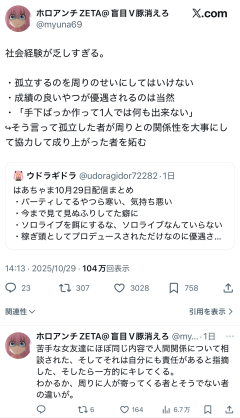 引用元: 24: Vtuberまとめ2025/10/30(木) 15:11:08.02 ホロアンチがまともなこと言ってて草 47: Vtuberまとめ2025/10/30(木) 15:11:53.34 >>24 わかってないね、こいつ 箱の中に敵がいる事実が重要だろ 55: Vtuberまとめ2025/10/30(木) 15:12:16.11 >>24 ぼっちちゃん言われてんぞ 73: Vtuberまとめ2025/10/30(木) 15:12:58.32 >>24 ゼータさんすいませんっした! 76: Vtuberまとめ2025/10/30(木) 15:13:02.45 >>24 ぼっちアイコンで社会経験語り出すの面白いな 89: Vtuberまとめ2025/10/30(木) 15:13:21.38 >>47 アタオカのことなんてこいつもわからんだろ 125: Vtuberまとめ2025/10/30(木) 15:14:33.35 >>24 ぼっちちゃん…!? 259: Vtuberまとめ2025/10/30(木) 15:17:51.10 >>24 すまん草…