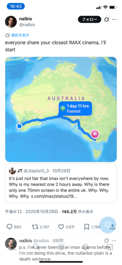 【悲報】オーストラリア人、最寄りのIMAX映画館が遠すぎて咽び泣くwwww