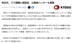 1 :                                  狩猟解禁!!🐻    秋田市、クマ捕獲に報奨金 公務員ハンターも募集(共同通信) - Yahoo!ニュース  相次ぐクマ被害の防止に向け、秋田市は30日までに、クマを捕獲したハンターに1頭当たり1万円の報奨金を支給することなどを盛り込んだ緊急対策を発表した。現場に出動する猟友会員の報酬も現行の4千円から8千円に倍増させる。   報奨金の支給は本年度限りで、狩猟期間の11月1日~来年2月15日までの捕獲が対象。個体数の減少を目的とし、全国のハンターにも協力を呼びかける。安定的な駆除のため、公務員としてハンターを募集・採用することも明らかにした。全文はソースで                                                             2 :                                  安すぎやろ                                                            4 :                                  0が一桁足りない😰…