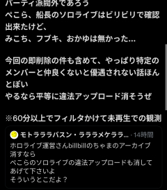 引用元: 38: Vtuberまとめ2025/10/31(金) 10:42:55.99  あの、表に正論言われてます… 何故かぺこらマリンのソロライブやメン限はビリビリにあるのにみこのは昨日とメン限も全部消されてます… ほんとに都合悪いとすぐ消すんだな   48: Vtuberまとめ2025/10/31(金) 10:43:07.74 >>38 あ 54: Vtuberまとめ2025/10/31(金) 10:43:28.84 >>38 これマジなんよな ほんとに都合悪ぃとすぐ消すのが表にもバレた 73: Vtuberまとめ2025/10/31(金) 10:44:07.49 >>38 あーあ 129: Vtuberまとめ2025/10/31(金) 10:45:53.92 >>38 ちゃんと消せよって主張だけはあってる 131: Vtuberまとめ2025/10/31(金) 10:45:57.16 >>38 どんどんリークの信憑性上がっていくの草 192: Vtuberまとめ2025/10/31(金) 10:47:34.74 >>38 てかもとホロの人が22年からとあるユニットが優遇されてるっぽいこと言ってるしね 関係性的にもぺこらではないだろうし 234: Vtuberまとめ2025/10/31(金) 10:48:59.45 >>38 これマジ? 306: Vtuberまとめ2025/10/31(金) 10:51:11.31 >>38 ガチで守護られてるやん…