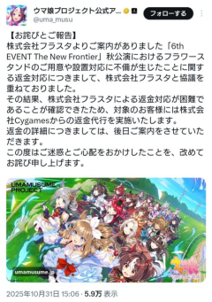 0:  名無しのトレーナー  25/10/31(金)15:15:06 No.1368064664    返金肩代わり        【お詫びとご報告】株式会社フラスタよりご案内がありました「6th EVENT The New Frontier」秋公演におけるフラワースタンドのご用意や設置対応に不備が生じたことに関する返金対応につきまして、株式会社フラスタと協議を重ねておりました。…— ウマ娘プロジェクト公式アカウント (@uma_musu) October 31, 2025     1: 名無しのトレーナー  25/10/31(金)15:15:53 No.1368064814    ソシャゲで代行って聞くとびっくりするな    2: 名無しのトレーナー  25/10/31(金)15:16:14 No.1368064889    流石サイゲだなんともないぜ    3: 名無しのトレーナー  25/10/31(金)15:16:23 No.1368064913    これ結局不備の内容ってわかったの?    4: 名無しのトレーナー  25/10/31(金)15:17:01 No.1368065029    すげぇなゴミみたいな業者のために返金肩代わりしてくれんのか…    5: 名無しのトレーナー  25/10/31(金)15:17:17 No.1368065085    プロセカも返金代行の方針     【お知らせ】「プロジェクトセカイ 5th Anniversary 感謝祭」お祝い花の不備に対する返金対応の続報について記載しております。ご迷惑をおかけしておりますこと、深くお詫び申し上げます。#プロセカ pic.twitter.com/m5rqurjClR— プロジェクトセカイ カラフルステージ! feat. 初音ミク【プロセカ】 (@pj_sekai) October 31, 2025     6: 名無しのトレーナー  25/10/31(金)15:17:46 No.1368065179    なんでもかんでも注文受け付けてたら完全にパンクしたから事故ったと嘘ついて時間稼ぎしてる間にトンズラこいただけなのに血も涙もねえ!    8: 名無しのトレーナー  25/10/31(金)15:18:02 No.1368065238    フラワースタンド業界ってそんなに経営状態悪かったんだ    9: 名無しのトレーナー  25/10/31(金)15:18:02 No.1368065240    >すげぇなゴミみたいな業者のために返金肩代わりしてくれんのか…まあそのゴミ業者推奨にしちゃってた部分はあるからな    13: 名無しのトレーナー  25/10/31(金)15:18:49 No.1368065396    これサイゲ側からフラスタに代わりに引き換えてやるから早く返せよ?って圧はかけるだろうし自分の地位落とさずに向上させるにはいい手ではあるんじゃない    15: 名無しのトレーナー  25/10/31(金)15:19:04 No.1368065441    サイゲが肩代わりとかちゃんとケツモチするんだなサイゲも債務不履行された被害者ではあるのにな    17: 名無しのトレーナー  25/10/31(金)15:19:19 No.1368065490    おあしすするわけには行かないにしても全額肩代わりは頑張ったな    19: 名無しのトレーナー  25/10/31(金)15:19:37 No.1368065548    推奨してたからと言って返金代行するまでのいわれはないだろ…    20: 名無しのトレーナー  25/10/31(金)15:19:54 No.1368065596    まあライブ参加者全員がフラスタ送ってるわけでもないから金額自体はそこまでいかんのか…?相場を知らんけど    21: 名無しのトレーナー  25/10/31(金)15:19:55 No.1368065601    >結局事故は嘘だったのかよ!事故自体はマジだった筈    23: 名無しのトレーナー  25/10/31(金)15:20:24 No.1368065706    あの会社飛んでたのかマジで最近よくある集金だけして逃げるやつじゃん    24: 名無しのトレーナー  25/10/31(金)15:20:30 No.1368065732    セガの方は業者が払うのかと思ったら無理そうだったらセガが払うって言ってんななんなんだよこの業者    25: 名無しのトレーナー  25/10/31(金)15:20:32 No.1368065739    対応しましたってアナウンス代だからな…    26: 名無しのトレーナー  25/10/31(金)15:20:38 No.1368065765    >推奨してたからと言って返金代行するまでのいわれはないだろ…いや…    30: 名無しのトレーナー  25/10/31(金)15:20:52 No.1368065823    これで一応訴訟しようとしてた人も納得…はしないだろうけどとりあえず引き下がれるところまでのラインになったかな    31: 名無しのトレーナー  25/10/31(金)15:20:55 No.1368065838    まあどうせつぶれるしなあそこ・・・    32: 名無しのトレーナー  25/10/31(金)15:20:56 No.1368065841    なんで推奨しちゃったの…    33: 名無しのトレーナー  25/10/31(金)15:21:00 No.1368065857    推奨してただけでここしかダメはプロセカなんだよなアンチには関係ないか    34: 名無しのトレーナー  25/10/31(金)15:21:04 No.1368065867    かなりの金額の損失だろこれ    35: 名無しのトレーナー  25/10/31(金)15:21:08 No.1368065881    推薦・選定した側にも一定の責任があると言えばまあそうかもだけど実際責任取らされるところを見るとお気の毒としか言えねえ    39: 名無しのトレーナー  25/10/31(金)15:21:28 No.1368065950    この業者は前回の春公演ではしっかり仕事して実績出してたからななんか今回の秋公演ではやらかして駄目業者扱いになったけど    40: 名無しのトレーナー  25/10/31(金)15:21:38 No.1368065990    >まあライブ参加者全員がフラスタ送ってるわけでもないから金額自体はそこまでいかんのか…?>相場を知らんけどウマ娘だけで50基くらいらしいからだいたい10万として500万そこにプロセカもドン    41: 名無しのトレーナー  25/10/31(金)15:22:03 No.1368066076    会社の規模に比べたらはした金って言うのは楽だが払う方は堪らんだろ    43: 名無しのトレーナー  25/10/31(金)15:22:24 No.1368066144    あの