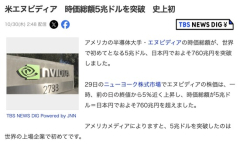 1 :                                  アメリカの半導体大手・エヌビディアの時価総額が、世界で初めてとなる5兆ドル、日本円でおよそ760兆円を突破しました。    29日のニューヨーク株式市場でエヌビディアの株価は、一時、前の日の終値から5%近く上昇し、時価総額が5兆ドル=日本円でおよそ760兆円を超えました。    アメリカメディアによりますと、5兆ドルを突破したのは世界の上場企業で初めてです。    エヌビディアの時価総額は今年7月に世界で初めて4兆ドルを突破したばかりです。 全文はソースで                                                               2 :                                  どう見てもバブルです  ありがとうございました                                                            3 :                                  ビデオカードRivaを27年前に買ったな  こんなに成長するとはね…
