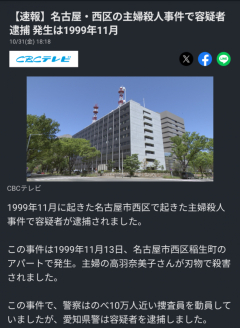 1: 名無しのアニゲーさん  2025/10/31(金) 18:27:40.180 ID:bqv1vpPAK きたな   【速報】名古屋・西区の主婦殺人事件で逮捕の女 きのう警察署に出頭 「あっています」と容疑認める 26年前の未解決事件に進展 愛知県警この事件は1999年11月13日、名古屋市西区稲生町のアパートで、主婦の高羽奈美子さん(当時32歳)が刃物で殺 害されたものです。この事件で、警察はのべ10万人近い捜査員を動員していましたが、愛知県警は容疑者を逮捕しました。殺 害された高羽奈美子さんの夫、悟さんは、事件の風化を防ごうと、現場のアパートを借り続けていました。発生からまもなく26年、1999年11月に名古屋市西区で起きたこの殺人事件で、容疑者が逮捕されました。逮捕されたのは名古屋市港区のアルバイト安福久美子容疑者69歳です。安福容疑者はきのう1人で出頭し、きょう殺人の疑いで逮捕されました。現場に残された血痕とDNA型が一致したため、逮捕に至ったということです。安福容疑者は、警察の調べに対し「あっています」と容疑を認めているということです。悟さんはJNNの取材に対し、「とにかくほっとした」と話しています。…