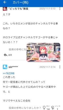 引用元: 464: Vtuberまとめ2025/11/01(土) 00:17:49.18 あの…株板でド正論かまされてます… 504: Vtuberまとめ2025/11/01(土) 00:18:16.02 >>464 消せ 505: Vtuberまとめ2025/11/01(土) 00:18:16.05 >>464 いつものことだけど 506: Vtuberまとめ2025/11/01(土) 00:18:17.42 >>464 それはそう 516: Vtuberまとめ2025/11/01(土) 00:18:23.64 >>464 ひん 535: Vtuberまとめ2025/11/01(土) 00:18:36.35 >>464 ホロメンの盾! 543: Vtuberまとめ2025/11/01(土) 00:18:41.97 >>464 黙れええええええええええええええ 550: Vtuberまとめ2025/11/01(土) 00:18:48.63 >>464 正解 551: Vtuberまとめ2025/11/01(土) 00:18:49.21 >>464 言うほど正論か? 566: Vtuberまとめ2025/11/01(土) 00:19:00.62 >>464 確かになんでさくらみこがやるんだろ? 570: Vtuberまとめ2025/11/01(土) 00:19:01.37 >>464 ちゃんと配信見てるか? みこのチャンネル以外でやることじゃないぞこの内容 完全にみこが今まで粘着されてた話してんのにどこでやんだよ こうなる前にホロ公式が対応してねえのが悪いんだよ無能が 595: Vtuberまとめ2025/11/01(土) 00:19:14.96 >>464 YAGOOはただのおめでとうbotだから 618: Vtuberまとめ2025/11/01(土) 00:19:23.93 >>464 ぺこら守るために忙しいからな 620: Vtuberまとめ2025/11/01(土) 00:19:24.13 >>464 アニメとかでもよく声優の盾ってのが あるでな 633: Vtuberまとめ2025/11/01(土) 00:19:26.66 >>464 リテラシー講座と同じなんだよなタレント盾にしてる 何かあればタレントが自発的にやったと逃げれるから 648: Vtuberまとめ2025/11/01(土) 00:19:32.26 >>464 赤くしよう 664: Vtuberまとめ2025/11/01(土) 00:19:37.29 >>464 わりい健常は去ってくれないか 711: Vtuberまとめ2025/11/01(土) 00:20:03.79 >>464 ヤゴーがやったところで見ないだろ 721: Vtuberまとめ2025/11/01(土) 00:20:07.07 >>464 残業になるでしょーが! 776: Vtuberまとめ2025/11/01(土) 00:20:44.45 >>464 さくらみこが自分で言いたいって言ったんじゃない? 783: Vtuberまとめ2025/11/01(土) 00:20:48.72 >>711 見なきゃ見ないでええやん 動くのは弁護士なんだから 801: Vtuberまとめ2025/11/01(土) 00:20:58.59 >>464 その通りで草 847: Vtuberまとめ2025/11/01(土) 00:21:28.69 >>464 今度はこれで表で広めてくれ 848: Vtuberまとめ2025/11/01(土) 00:21:28.77 >>464 ヤゴーはこういう場面絶対に出てこないよな 893: Vtuberまとめ2025/11/01(土) 00:21:56.42 >>464 ぐうの音も出ねえ 937: Vtuberまとめ2025/11/01(土) 00:22:19.21 >>464 それはそう 971: Vtuberまとめ2025/11/01(土) 00:22:37.14 >>783 多くの人に見てもらったほうが効果あるだろ…
