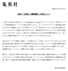 1 名前:名無しさん@おーぷん[] 投稿日:25/11/01(土) 12:38:11 ID:kIgY 心血を注いで作品を作り上げた作家の尊厳を踏みにじり、多く の人々の権利を侵害することのうえに成立してよいはずはありません。 漫画好きとしては大変喜ばしいこと声明ではありますが、ワンピース風生成AIを出していたことや、ジャンプルーキーの生成AI漫画はどうなるんでしょうか — 寝 (@nenene_1109) November 1, 2025 3 名前:名無しさん@おーぷん[] 投稿日:25/11/01(土) 12:39:33 ID:kIgY 同じく講談社や小学館からなる日本漫画協会も声明を発表 「生成AI時代の創作と権利のあり方に関する共同声明」が発表されました。詳しくは添付画像資料またはリンク先をご覧ください。2025年10月31日公益社団法人日本漫画家協会 pic.twitter.com/SSozt99l8z— 日本漫画家協会公式 (@mangaka_kyokai) October 31, 2025 4 名前:名無しさん@おーぷん[] 投稿日:25/11/01(土) 12:39:53 ID:kIgY 【抜粋】①生成AI事業者はAIにデータを学習させる段階から権利者の許諾をとってね(オプトイン)②どんなデータを学習させたのかはっきりさせてね(透明性)③権利者がデータ利用を許諾した場合、対価を払ってね(報酬)これを実現するために権利者、AI事業者、関係省庁と連携・協力が不可欠だよ。— エトウタカヒト (@E_to_H) October 31, 2025…