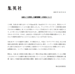 1: 2025/11/01(土) 05:21:36.11 ID:SPZ/jrSK0 集英社 「心血を注いで作品を作り上げた作家の尊厳を踏みにじり、多くの人々の権利を侵害すること」 「コンテンツ産業の基盤を揺るがし続ける生成AIサービスを利用した侵害のスパイラル」 「コンテンツ保護に向けた国家レベルでの対応も不可欠」 KADOKAWAらアニメ・出版業界18団体が「生成AI時代の創作と権利のあり方に関する共同声明」発表 動画生成AIの運用方針を非難 【共同発出者】(五十音順) 一般社団法人 日本動画協会>>1 株式会社秋田書店 株式会社一迅社 株式会社宙出版 株式会社 KADOKAWA 株式会社コアミックス 株式会社講談社 株式会社小学館 株式会社少年画報社 株式会社新潮社 株式会社スクウェア・エニックス 株式会社竹書房 株式会社 TO ブックス 株式会社日本文芸社 株式会社白泉社 株式会社双葉社 株式会社芳文社 株式会社リイド社…