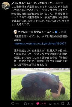 1 : 以下、?ちゃんねるからVIPがお送りします :2025/11/01(土) 20:06:29.146 ID:UKp4FrQp0.netこの姿勢だと手指足首もってかれるんじゃ?と思って軽く調べてみたけど、ツキノワグマはまだこの姿勢の攻略法がわからないらしく、防護姿勢をとった7件では重傷者なし、手足欠損なしな模様で確率的には95%CIで少なくと42%は守られてたといえるスコア。 — 💉×7ヰるへるむ・わっかかわっかー・三世 (@marman_band) November 1, 2025転載元スレッド:…
